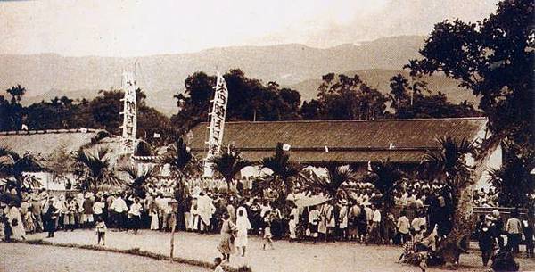 1910年,阿美族馬蘭社的公廨,由竹子、木材和茅草屋頂建成,有一個小圍牆和木門,已經具有庭院造型的雛型。阿美族是台灣人口最多的原住民族群,主要分布在花蓮、台東和屏東等地地區。馬蘭社則分佈於台東縣成功鎮、東河郷、卑南鄉、太麻里鄉等地,公廨原意是指官署,後為公共議事的場所,或是原住民的宗教場所。此照片顯示阿美族人丁眾多,在氏族為中心的社會組識運作中,已經出現類似漢人的公共會堂的場所。事實上,在漢人社會中,協調和處理氏族和鄰里糾紛事情時,正是在廟宇等宗教場所,如此才能由「神明見證」。阿美族人亦受到漢人民間文化影響,照片中幾名少年在公廨前持長槍武器戒備,長槍的槍頭與箭頭都是用木與竹製成的。阿美族主要生活在臨海平原地區,主要是耕種小米,也有一部漁獵,最大的祭典是豐年祭,反映其主體已是農耕民族。https://www.facebook.com/groups/4163124053704144/permalink/4929769080372967/