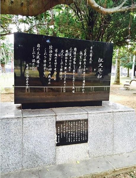隔天步行到那霸市區東南的「与儀公園」,這裡被視為是那霸市最好的賞櫻之地,在盛夏的此時,則盛開著扶桑花。我在公園一隅看見一塊石碑,上頭寫著:「恆久平和」,並刻著日本憲法第9條: