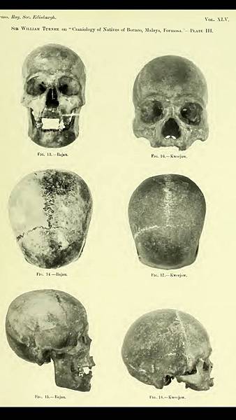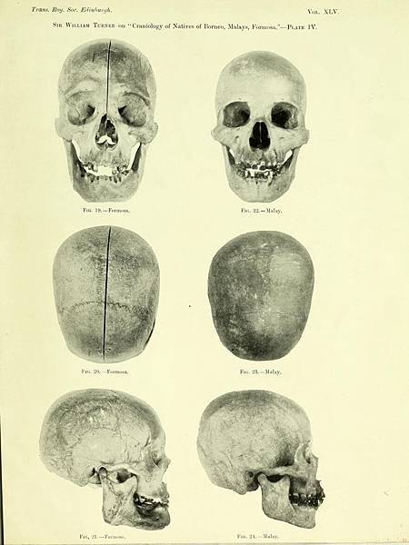 圖為英國學者透納1907年發表的著作,其中編號19到21為來自台灣的頭骨,據信是牡丹社事件排灣族勇士的骨骸。(圖取自英國Wellcome Collection網站,英國皇家外科醫學院提供)