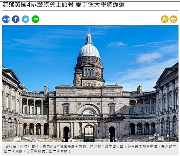 台灣原民遺骨漂泊海外150年 愛丁堡大學返還5日抵台 1874年日本以琉球漂民在台遇害為由,出兵台灣,與今天牡丹鄉所在位置的台灣原住民激烈戰鬥,日軍隨後取下超過10名原住民的頭顱作為戰利品,其中4具輾轉來到蘇格蘭,被收藏在愛丁堡大學。