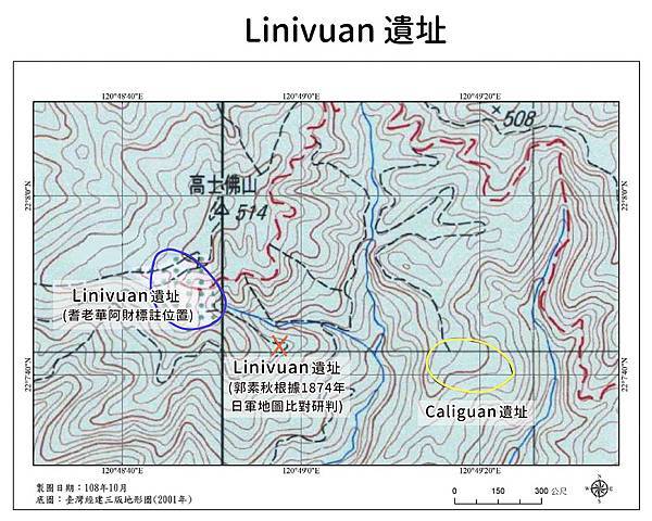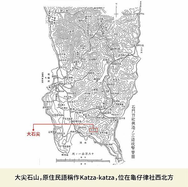 圖中的「大石尖」一帶即為龜仔律社位置,此處地高,能一覽南灣動態,龜仔律社因而可發現船隻擱淺、漂民誤闖,也能監看美軍艦隊。根據《高砂族系統所屬の研究》,大尖石山原住民語是 Katza-katza,龜仔律社與外族打仗前會先到山頂占卜。