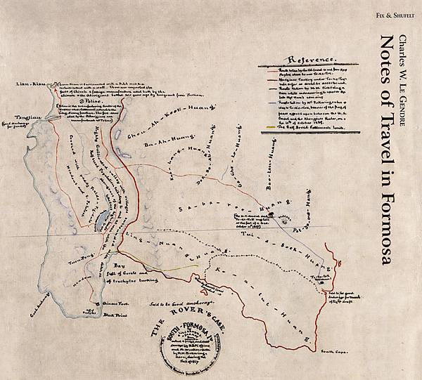 羅妹號事件後,李仙得多次來台調查,寫下「台灣紀行」手稿。由於對恆春半島部落、地形、漢番勢力瞭若指掌,牡丹社事件時,日軍重金禮聘他作為顧問。圖為李仙得繪製的恆春半島地圖,紅線為卓杞篤轄下的原住民領土,地圖中也標註各個番社。