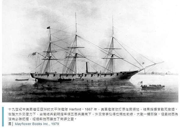 十九世紀中美國遠征亞洲的太平洋艦隊 Harford。1867 年,美軍艦隊攻打原住民領地,結果指揮官戰死撤退。在強大外交壓力下,台灣總兵劉明燈率領五百兵勇南下,外交官李仙得也親赴前線,大戰一觸即發。但最終因為沒有必勝把握,而後才有了南岬之盟的約定。圖│ Mayflower Books Inc., 1979