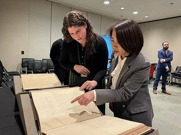 屏東縣長周春米(右)參訪美國國會圖書館見證「南岬之盟」李仙得的國會報告文件。(屏東縣政府提供)