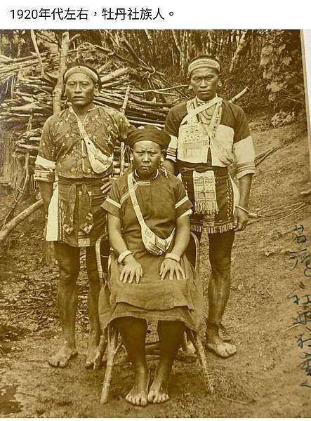 1910 年代,一群排灣族牡丹社族人,男女裝備齊全的站在小徑旁大合影。穿著長裙的女子手持拐杖站在下排,男子著短上衣、配戴獵刀站在上排, 每個人身上則必備檳榔袋。排灣族的拐杖大部分為竹製或籐製品,拐杖設計為 8 節、並會在外表彩繪線條圖騰,獵刀則是青銅材質,作為隨身配戴之物, 以實用的功能為主,並不會特意雕塑圖騰,這些都是隨著生活發展而出的相應工具。排灣族具有很高的工藝技術能力,並且饒勇善戰。清代,牡丹社族 人最早與來犯的日軍現代部隊作戰,在台灣史上留名。中華之窗 | 排灣族牡丹社族人 | Facebook https://bit.ly/3TciYDp