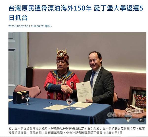 2023/11/3 20:36(11/6 08:02 更新)台灣原民遺骨漂泊海外150年 愛丁堡大學返還5日抵台 | 文化 | 中央社 CNA https://bit.ly/4g0yZGz
