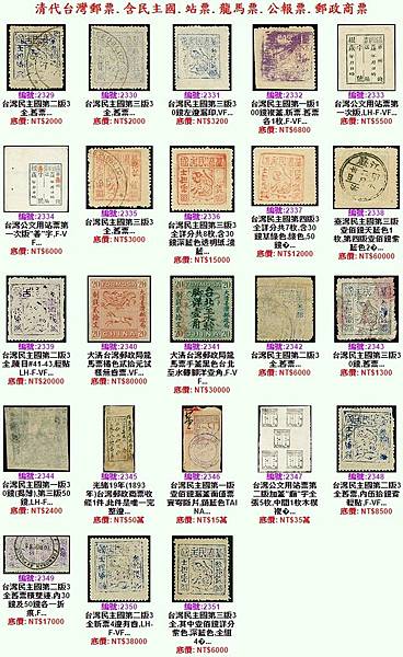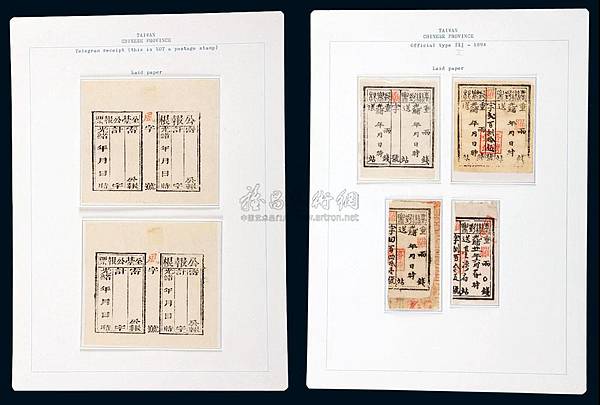一、台灣郵票:免費供官府寄文書貼用,使用時記重量不付郵費。這種郵票前後分兩版印刷,第一版郵票上端有篆文“台灣郵票”4字,余均為扁宋字體。票幅47 ×62毫米,票根較窄,只印有楷體“根”字及填寫一行發信日期、時間。第二版票幅較大,有51×66毫米,主要區別在票根位置增大,上端有篆文“郵票根” 3字,下面3行字,同郵票一樣,還要填寫信件重量及送 * * 站。孫君毅、何大仁、林其泉合作的《台灣早期郵政和郵票》一文(見《八閩郵文精選》),認為有“郵票根”3字、票幅大的為先印,票幅小的為後印,疑有誤,應據台灣張愷升《台灣郵票郵戳郵資史》(上冊)及北京燕山出版社的《中國郵票全集》(清代、中華民國卷)所介紹的為準確。在《近代郵刊》四卷四期上,澳門集郵家王炳輝還出示一幅“台灣郵票”第二版的全張印樣,5張郵票3行“二一二”圖式排列,印樣郵票中縫均已蓋上“廟”字、站戳,及填寫了編號。