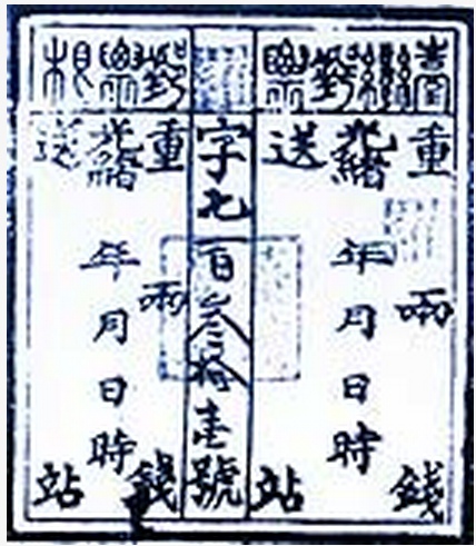 三、正站與傍站互寄,每站郵票一張,郵費三十文,續重則每五錢三十文。