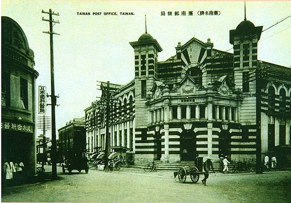 日本人於一八九五年十月二十四日在台南設立第十野戰郵便局,隔年一八九六年四月一日後改為台南一等郵便電信局。最初的營業地點沿用清朝的郵政機構,設在溫陵媽廟,是日本時代初期,第一個郵局與電信局合併的郵便電信局。這間郵便電信局,於一九一○年,遷至由森山松之助所設計的新廳舍,位置即今忠義路和民生路口,它是仿巴洛克風格建築,牆壁上的雕飾非常精細,裡面是挑高的大廳,非常氣派,也是一棟相當漂亮的建築物。大門進去右手邊為集郵櫃台,我曾在這棟大樓進出多次,在集郵櫃台買郵票。但這棟建築在一九七三年被拆除,改建成中華電信機房,成了普通的一棟水泥建築。