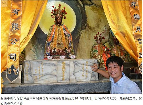 台南市新化區洋仔保生大帝廟有全台首廟之稱,廟中供奉青斗石南海佛祖神像,背後刻有「明萬曆丙辰年弟子蔡保禎造」,證明這尊神像在西元1616年就來到台灣,該廟主委台南市議員林志聰說,這尊南海佛祖也就是觀世音菩薩是最早駐台的神像,比鄭成功1661年來台還早45年,是鎮廟之寶。