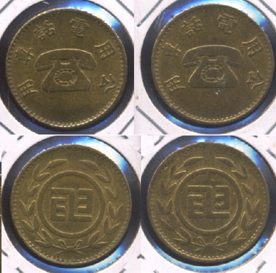 十元型(白銅):正面:逆時鐘文字"公用電話專用"、電話圖案;反面為十一葉嘉禾,中置電信局標誌。