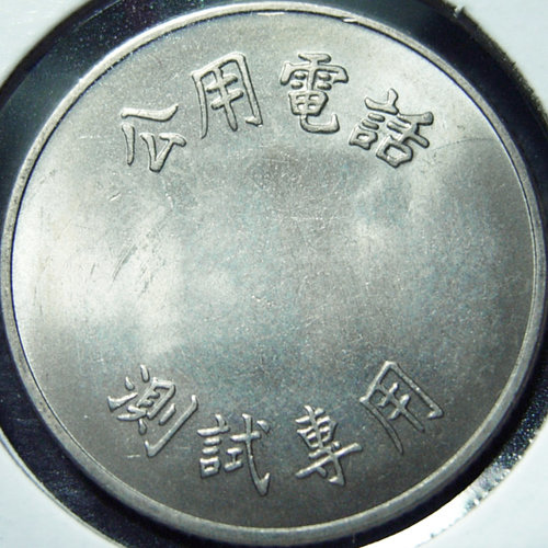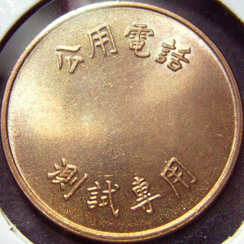 一元型(黃銅)、五元型(銅鎳)大小,正面:順時鐘文字"公用電話"、"測試專用";反面為電信局標誌。