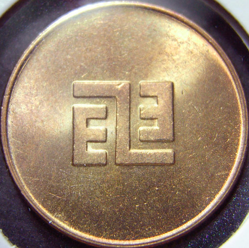 一元型(黃銅),正面:上方為逆時鐘弧形文字"公用電話"、中央為電信局標誌;反面無文字,有溝槽一道。