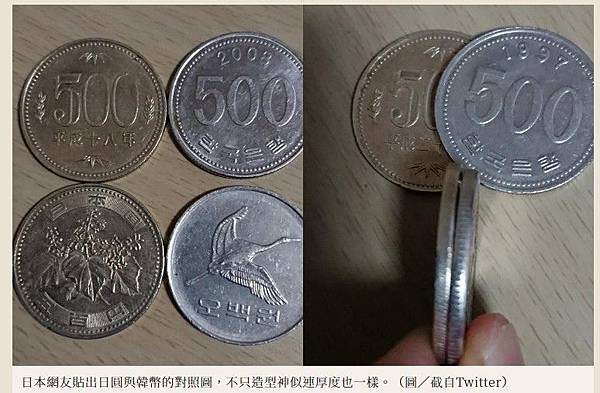 日本網友貼出日圓與韓幣的對照圖,不只造型神似連厚度也一樣。(圖/截自Twitter)