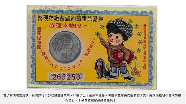 4月4日起,台灣銀行與郵政儲金匯業局,聯合舉辦「鼓勵兒童儲蓄繳存1元硬幣贈獎辦法」,印製了30萬張幸運券,希望學童家長們能鼓勵子女,將撲滿裡收存的硬幣繳存銀行,不但灌輸兒童把錢存入金融機關可以生息的觀念,也能解決市面上硬幣短缺的現象。