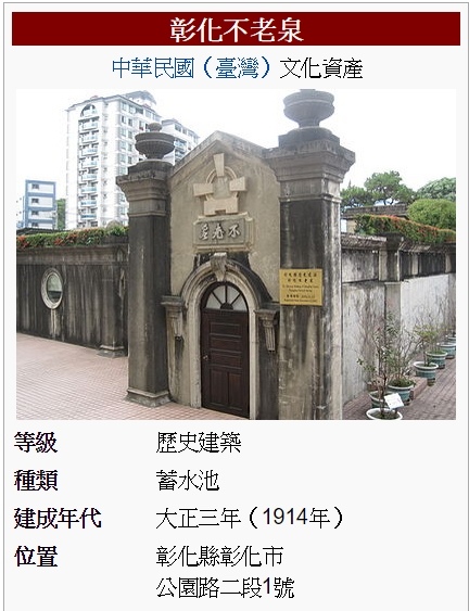 不老泉興建完成於大正3年(1914)為彰化市最早之自來水水源地淨水池,也是彰化縣首座淨水廠,