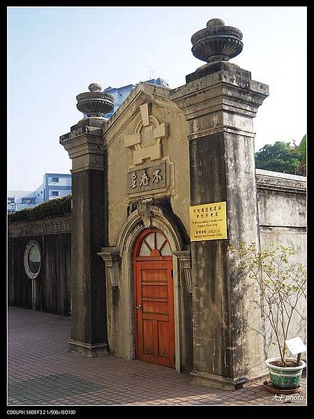 端柱頭雅致脫俗,一座刻著「不老泉」,另一座則刻著「地靈釀出甘漿」,內部門柱上有當年再擴建時刻的「大正三年完工」字樣,當年水公司是從「不」門中抽水過濾,再送至「地」門慢濾池以砂石過濾城淨水,再供應民生用水。當年不老泉之水係引貓螺溪水,因泉水源頭無名溪水源源不絕,於是時人將之命名為「不老泉」。