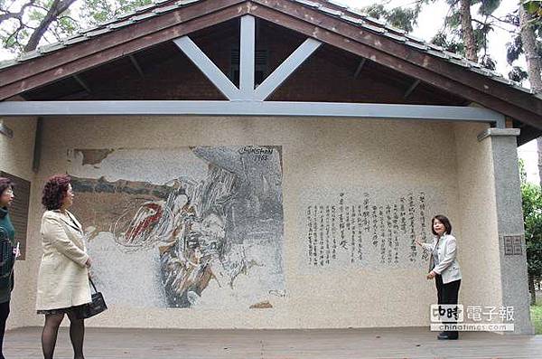彰女「紅樓」側邊牆面設計「李仲生紀念廣場」,翁金珠介紹以李仲生作品和名言字跡作壁畫。(吳敏菁攝)