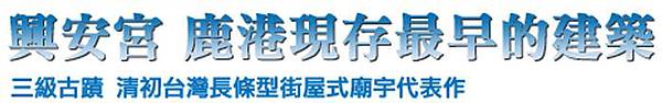 | 指定/登錄理由 | 1.為長條型的廟宇建築:傳統街屋式廟宇屬於一種小型寺廟,隱身於民宅之間,廟的格局為兩殿式建築,面寬只得單開間,第一進為三川殿、第二進為拜殿及正殿,全廟使人感覺狹長而深遠,是鹿港最早的媽祖廟之一。 2.蘊藏百年古物,文化至寶:清初木雕之軟身聖像,「開臺興安宮全貌」彩繪古圖為廟內現存最為珍貴之古文物。另外,正殿神房內懸咸豐二年「奠安山海」匾,門楣上的光緒十三年「慈航普渡」匾,以及記載當年廟產之「奉憲勒碑」皆彌足珍貴。 |