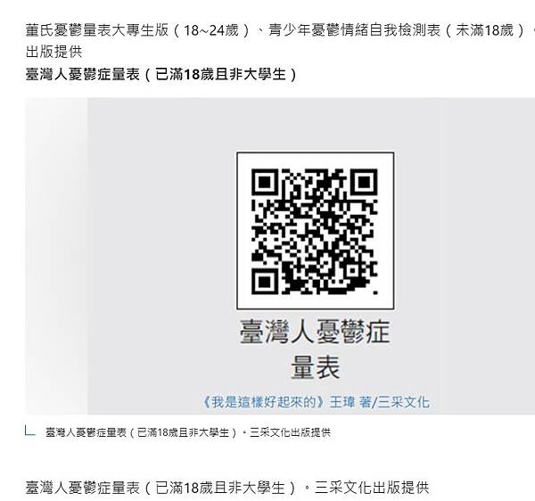 董氏憂鬱量表大專生版(18∼24歲)、青少年憂鬱情緒自我檢測表(未滿18歲)。三采文化出版提供