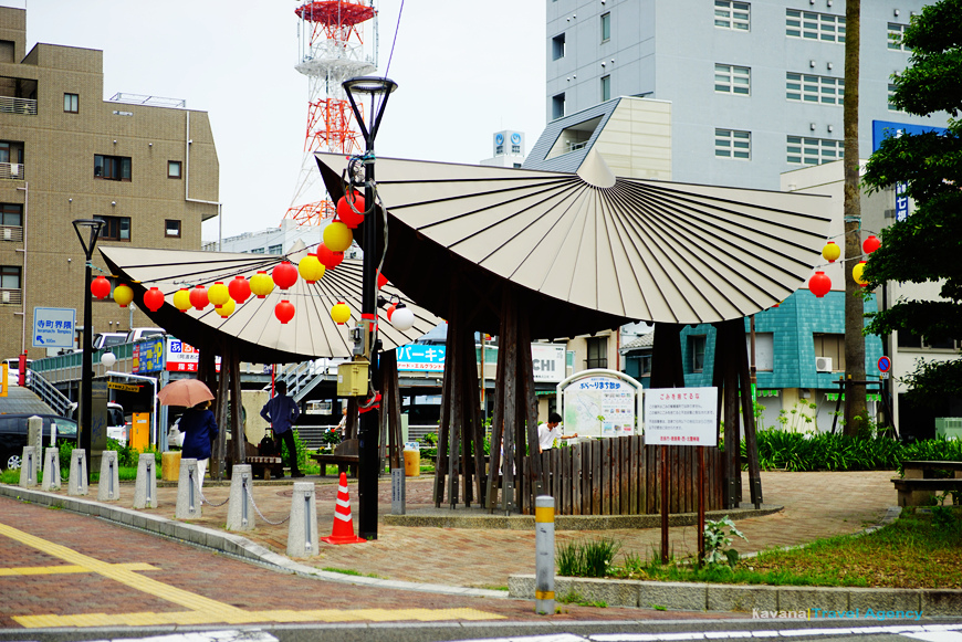 前方公園的涼亭是阿波舞女性舞者頭上戴的的網笠~