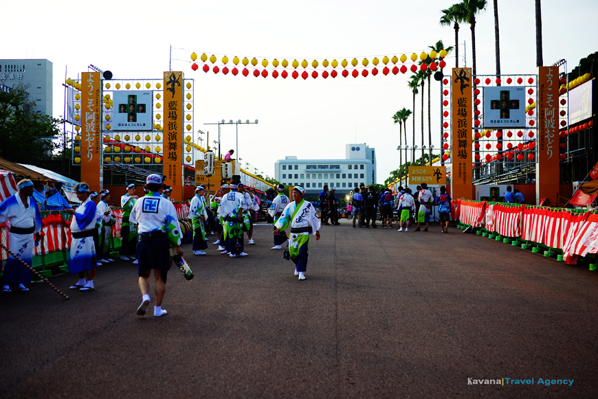 白天的特色是有名的“連(由數十人組成的團體)”在舞台上表演的“選拔(意即精選)阿波舞”(收費)。過了晚上6點以後,街上更加熱鬧,以市中心的公園、可以在近處觀看舞蹈的“演舞場”、遊客可以參與的“舞蹈廣場”、連接不同演舞場的“舞蹈大道”以及町內會(相當於鎮居委會)和商業街主辦的“街角廣場”等各會場為中心,節日氣氛逐步達到高潮,並一直持續到晚上10點半左右。