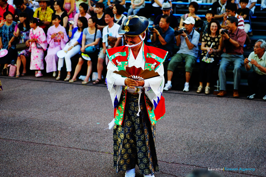 男性舞者身上穿著名為半天的浴衣,頭上綁著鮮豔的布巾,看起來好似日本傳統小偷的形象~