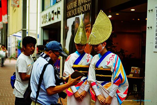 路上隨處可見阿波踊り的舞者,她們(只限女生舞者,男性舞者根本沒人理)是人群的焦點,許多人看到女性舞者就會上前要求合照。