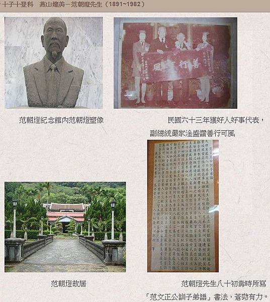 范朝燈先生,字公明,是范仲淹第廿九代後裔,育有十子二女;他的十個兒子,有三位博士、二位碩士以及五位學士,其中有五位高考、一位甲等特考及格,其中有台灣第一位醫學博士次子范光宇先生以及創立萬國法律事務所、曾任台灣省主席及行政院客家委員會主委的九子范光群先生,而有「十子十登科」之美譽,。民國四十五年考選部長史尚寬曾贈「燕山媲美」匾額祝賀;譽范朝燈是「現代竇燕山」,竇燕山教五子名俱揚,范朝燈先生教育十子可媲美竇燕山。