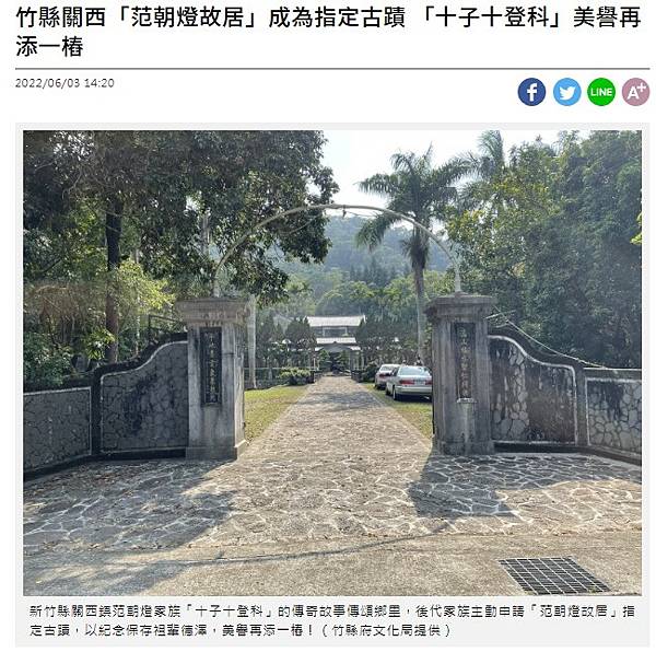 2022/06/03 14:20竹縣關西「范朝燈故居」成為指定古蹟 「十子十登科」美譽再添一樁 - 自由藝文網 https://bit.ly/3GSa8oK