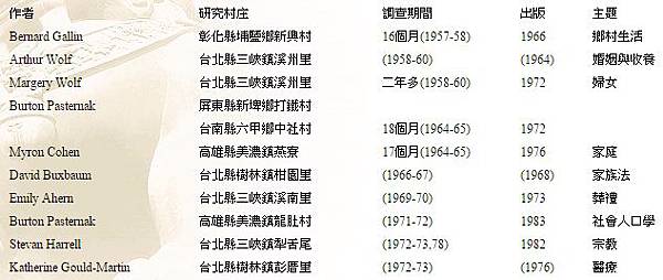1960年代以降, 出現很多西方人類學家研究台灣而撰寫的村落民族誌, 以下列舉幾本:
