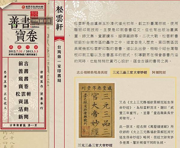 松雲軒是由盧崇玉於清代道光初年,創立於臺灣府城,使用雕版印刷技術,主要是印刷善書經文,但也有出版治臺輿圖、詩文集、童蒙讀本、譜牒籤詩等。二次大戰,松雲軒書版毀於台南市區的轟炸之中,遂宣告走入歷史。第四展區因典藏幾部松雲軒印製的善書,遂以此出發,概略介紹台灣雕板印刷工藝以及古書基本的版式,引導觀眾在領會善書內涵的同時,也能稍稍欣賞巧心設計,蘊含古韻的書冊之美。
