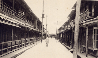 這張1920年代的明信片,由日本東京新原雜誌社出版,畫面中可以見到充滿日本傳統遊廓風情的建築形式,倚著二樓陽台穿著日本和服的女人,以及穿著日式制服走進遊廓的男性背影,為當時風化區的主要從業者與消費者,提供了貼切的註腳。