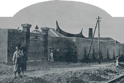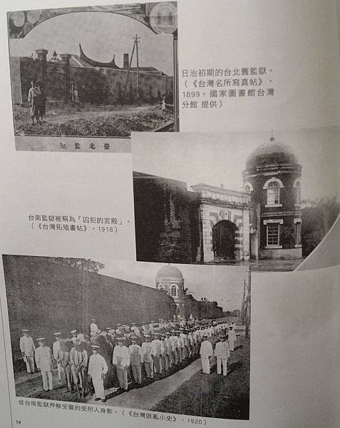 「日治初期的台北舊監獄」。殖民初期的台北監獄直接沿用清代衙門遺留建物,圖中可見圍牆內獄舍的中國傳統建築屋簷形式。