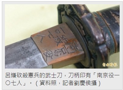 呂嫌砍殺憲兵的武士刀,刀柄印有「南京役一○七人」。(資料照,記者劉慶侯攝)