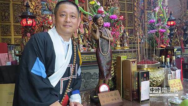 二林鎮廣懿宮供奉的鄧麗君金身「妙筠菩薩」22日正式亮相,「濟公律師」張庭禎述說原由。(鐘武達攝)