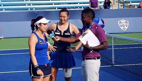 詹詠然(左)和妹妹詹皓晴攜手打進辛辛那提女雙決賽,賽後接受場邊訪問。 (圖/詹詠然提供)
