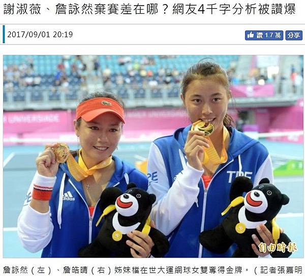 〔即時新聞/綜合報導〕網球女將詹詠然退出世大運混雙準決賽、趕赴美網引發非議,一名網友今發表超過4千字的分析,提出詹詠然過去征戰從未傳出因暈眩退賽、女雙賽後妹妹詹皓晴還帶有笑容等疑點,並點出詹詠然這次退賽與謝淑薇里約奧運退賽的不同,直指詹詠然退賽是「今年看過最完美的一齣戲」,該PO文至今有破千網友分享。