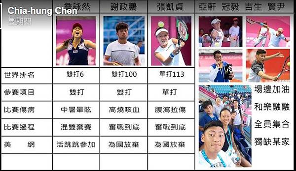 對於外界質疑「謝淑薇當時可以退奧運,詹詠然當然也可以退世大運」,Chia-hung Chen說,里約奧運時,謝淑薇並沒有要報雙打,是網協擅自幫她報名,且謝奮戰一整年將單打與雙打都拚進奧運資格,多爭取到一張教練證,是台灣唯一一人,但網協連一個教練都不給她,還抹黑她、辱罵她,因此她憤而退出國家隊;至於詹詠然退賽是為了什麼?Chia-hung Chen意有所指地說,大家都很清楚。