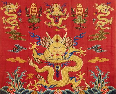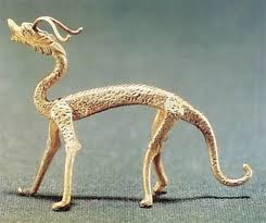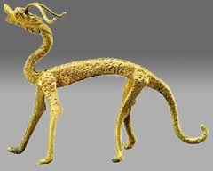 唐陝西省西安市南郊何家村唐窖藏出土。呈奔走狀。用纖細的陰線刻出眉毛、眼睛和頸部的毛髮,通體鏨刻細密的鱗紋,精美、異常而生動自然。