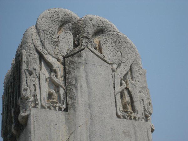 武則天豎立巨碑的初衷就是為了給自己歌功頌德。完整巨石,通高7.53米,寬2.1米,厚1.649米,重達百噸。高大雄渾,巍峨壯觀。與西邊的“述聖紀碑”相對應。其位其勢就足以表明了立碑者的主旨和自我評說。再者,碑上的圖飾更表達了一種豐功偉績。碑首刻有八條纏繞生動有力的螭龍,左右兩側各4條。螭是古代傳說中—種沒有角的龍。碑身兩側刻有龍騰若翔的“昇龍圖”,高4.12米.寬1.19米,龍爪鋒勁尖利。身軀矯健扭功,栩栩如生,這是迄今為止見到的最大的昇龍圖像。碑座陽面正中線刻“獅子圖”,長2.14米,寬o.66米。圖中雄獅昂首怒目,十分威武,其馬卻屈蹄俯首,非常溫順。整個“無字碑”渾然一體,雕刻精美,不愧為中國歷代群碑之冠。它已經強烈向世人展現豎碑者非同凡響的豐功偉績了!如此紋飾蓋為碑文鋪墊造勢的。