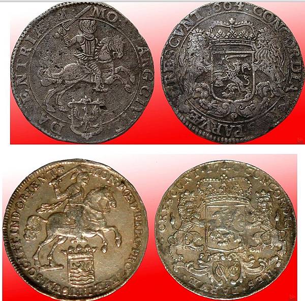 錢面:正面是一位武士身騎奔馬,一手持劍,一手拉僵繩,早期武士昂頭,後期武士頭正位;馬下盾徽各期有不同,周邊環寫荷蘭文。