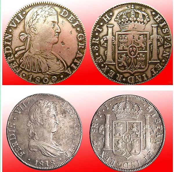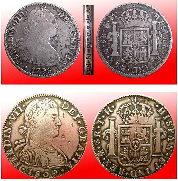 卡列羅四世1808 年駕崩斐迪南七世即位時,由於西班牙和墨西哥相隔路途遙遠,當時通訊和傳輸工具又不發達,墨西哥造幣廠接到新國王即位要鑄新幣以示慶賀時,卻不知新國王模樣,只好用卡列羅四世頭像配新趕製的斐迪南七世模具鑄造了一批幣,但流用無多,後多有收回溶毀,所以收藏甚為不易,但也給今天的我們帶來了一個新的研究收藏趣味版別。在斐迪南七世即位後,老國王卡列羅四世的幣模並沒有立即銷毀,一直鑄造到1809 年才退出歷史舞台。