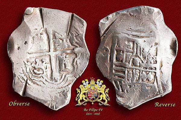 “地球幣”的背面是王冠覆蓋的東西半球以及其山川和海洋。它們分別代表新舊兩個世界。雙球的下面是代表直布羅陀海峽的水波。其左右兩個頂置皇冠的立柱是傳說中的大力神海格力斯之柱。其實是直布羅陀海峽接口處的兩個山峰。因為直布羅陀海峽連接地中海與大西洋,所以當時的歐洲人認為從地中海出了該海峽,就是未知世界。柱上捲軸鑄拉丁文 PLUS VLTR ,意為 “ 海外還有天地 ” ,上方的拉丁文 VTRAQUE VNUM (意為 “ 合二為一 ” )與幣中的雙地球圖案,寓意 “ 東西半球為西班牙單獨擁有 ” ,下方為鑄造年號及鑄地國標記。