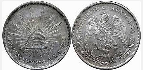 前的花邊鷹洋和1898年以後的直邊鷹洋。兩者規格相同:直徑39毫米,重量27.07克,成色90.30%。花邊鷹洋面值為8瑞爾(Real),直邊鷹洋面值為1比索(Peso)。銀元正面是一展翅雄鷹,嘴叼長蛇(花邊鷹洋蛇尾與鷹翅相連,直邊鷹洋蛇尾與鷹翅不相連),單腿立在仙人掌(國花)上,邊緣上方書西班牙文“ REPUBLIKAMEXIKANA(墨西哥共和國)。背面中央為一頂