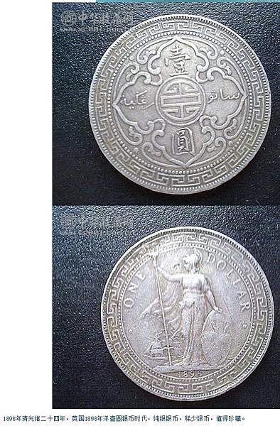英國銀幣,俗稱“站洋”,成色90%,重26克,幣面有一位海神戴頭盔,持杖站立,下放一米字盾,旁邊有一艘遠航帆船放洋圖,背面是一壽紋圖。這種銀幣華人拒用,時短時續,也流通二十多年