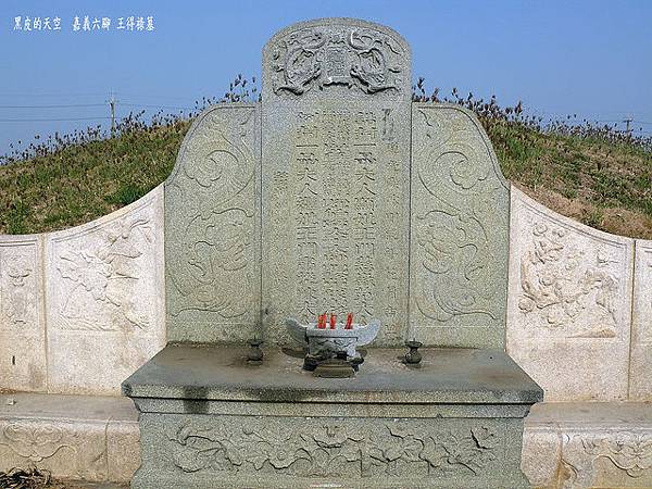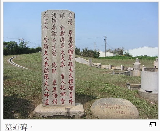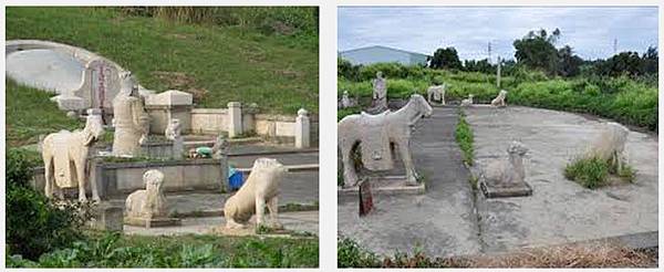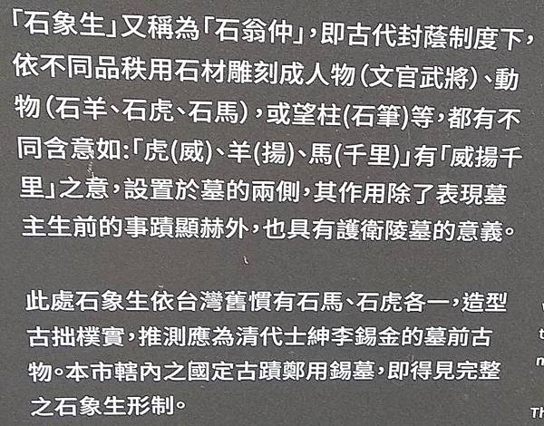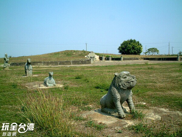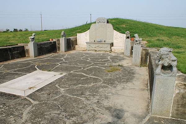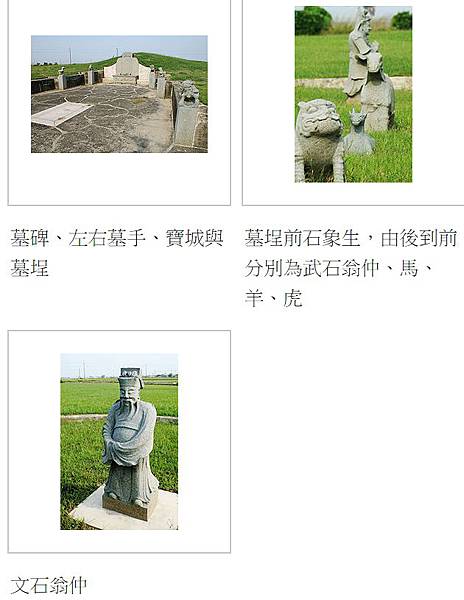 文化局補充,曲手包括欄杆柱與柱間的欄板,均以花崗石雕成,曲手欄杆柱頭分別為石印、石筆、石獅,左右對稱;墓前的石象生自內而外依次為石人、石馬、石羊、石虎以及石望柱等各一對,其雕刻細緻精美,石獸樸實可愛,石望柱刻著轉錄自咸豐元年閩浙總督王懿德所贈的柱帖,頗具有歷史價值。整體而言,這座背山面水、居高臨下、規模寬宏的墓地,是台灣官墓的佳構之一。