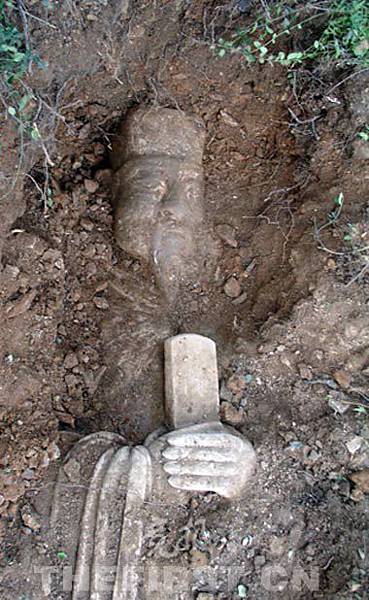 昨天,正在碧雲寺內進行日常施工的工作人員,在出土“武翁仲”的路北側再次挖到一尊石像,石像埋在土裏離地表不深,大約12釐米。出土的這尊石像是由一整塊漢白玉雕刻而成,長約3米、寬1米,重約5至6噸,下有石座。石像保存十分完整,雕刻得十分生動,身披朝服,手持牙笏,頭戴官帽,長鬚垂胸,一副“慈眉善目”的表情。