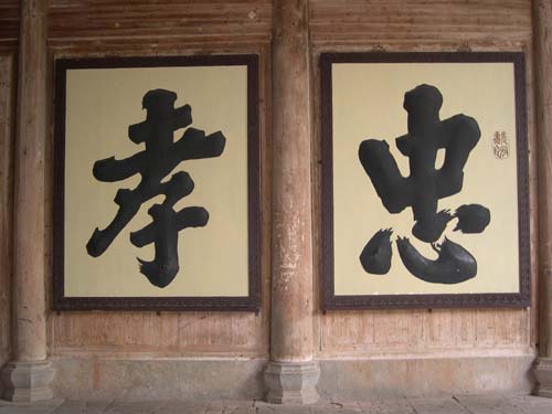 其次,宋代朱熹手書「忠孝節義」,成為各級學校校訓,台南首學明倫堂牆上就寫有「忠孝節義」大字,鸞堂也多在正廳壁上或製作匾牌宋代朱熹手書「忠孝節義」,也有鸞堂寫在絹布上,鸞堂內充滿了正氣和莊嚴的氣息。