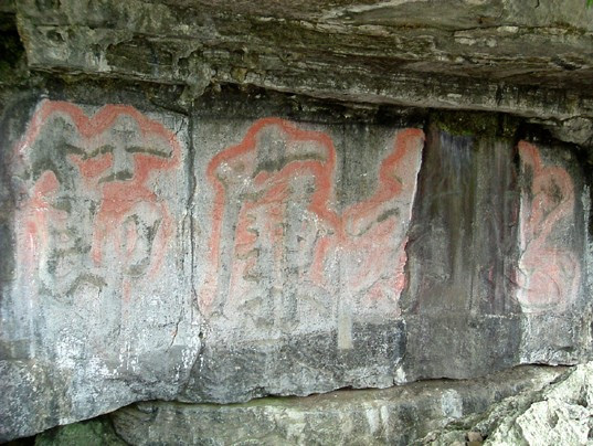 (有兩幅摩崖石刻,一幅是“忠孝廉節”,字高1.6米,寬1.2米,筆劃挖深0.2米,字體瀟灑遒勁。右側有“明太傅席書題”字樣。左側為明嘉靖十一年壬辰科殿試一甲探花高節題寫的“山海長年”,但字的高度、筆劃深度不及席書題的一半